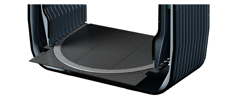HÜBNER turntable systems for the gangway section of trams can be flexibly adapted to various application scenarios. The systems are available in various designs – with multiple floor covering options or anti-slip tread plates. With their robust construction, these systems deliver a long service life and reliably meet the demands of daily tram operation. Segmented variants allow for easy installation and removal as well as quick access to components below the turntable; optionally available with quick-release fasteners.